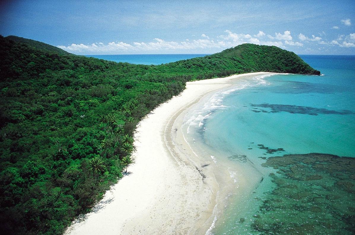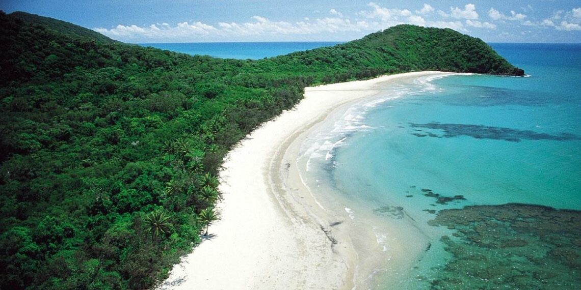 The surrounding environment is marked by dense rainforest growth reaching up to the edge of the shore, including tall trees, interwoven vines, and mangrove vegetation, forming a continuous green background along the coastline. There are no dominant cliffs or large rock formations along much of the coast, only open stretches of sand bordered by protected forest and marine areas. This meeting of reef and rainforest environments, together with the relative isolation and biological diversity of the region, gives the place a character that is not commonly found along other coastal locations in Australia.